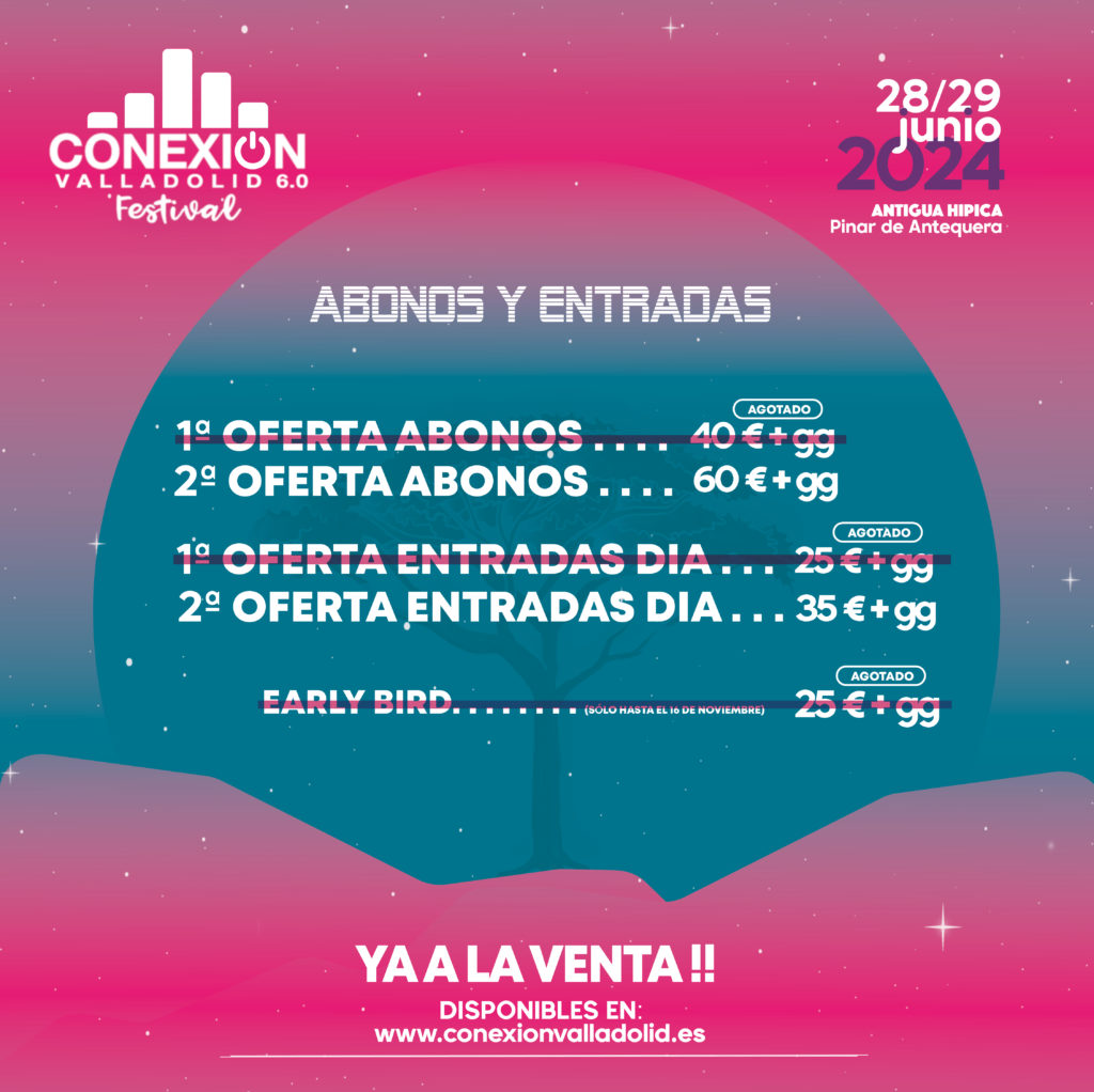 A la venta este jueves 24 de julio a las 12:00h. Tras el rotundo éxito de su séptima edición, Conexión Valladolid anuncia la salida a la venta de la primera oferta de abonos para su próximo año, que se celebrará del 26 al 28 de junio de 2026. Las entradas estarán disponibles en la web del festival a partir de hoy jueves 24 de julio a las 12:00h. La edición 8.0 llegará cargada de novedades… ¡no te la pierdas! Primera oferta de abonos a la venta hoy jueves 24 de julio a las 12.00h. COMPRA AQUÍ TUS ABONOS MIRA LA GALERÍA COMPLETA DE 2025 Instagram Facebook X-twitter