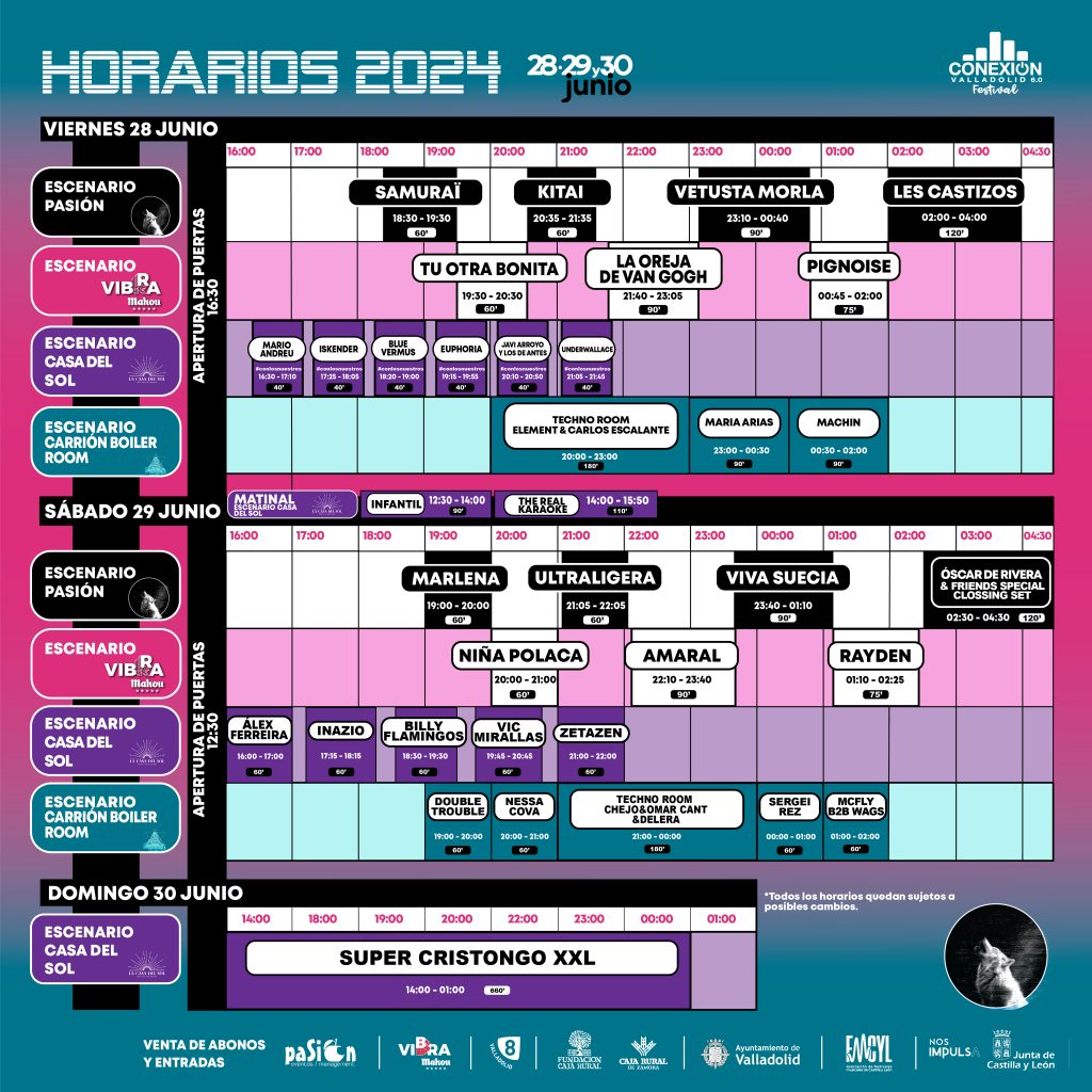 El Festival Conexión Valladolid 2024 desvela hoy los horarios oficiales de su sexta edición que se celebrará los días 28, 29 y 30 de junio en la Antigua Hípica Militar (Pinar de Antequera). Se ha preparado un cartel muy especial y variado con bandas de primer nivel que se irán repartiendo por los cuatro escenarios de este año (escenario PASIÓN, el escenario VIBRA MAHOU, el escenario CASA DEL SOL y el escenario de electrónica denominado CARRIÓN BOILER ROOM) para que nunca pare la música. El viernes 28 de Junio, el festival arrancará con las actuaciones de Samuraï (18:30h.), Tu Otra Bonita (19:30h.) y Kitai (20:35h.) hasta que llegue el anochecer, para después dar paso a La Oreja de Van Gogh (21:40h.), Vetusta Morla (23:10h.) y Pignoise (00:45h.) -que están inmersos en su gira 20 aniversario-. El concierto de Vetusta Morla es el único que dará la banda en Castilla y León antes de retirarse de los escenarios un tiempo, tal y como han anunciado recientemente. Los Djs Les Castizos pondrán el broche al día con su actuación de 02:00h. a 04:00h. Estos artistas se irán sucediendo en los escenarios Pasión y Vibra Mahou, en formato Twin para evitar esperas entre conciertos y mejorar así la experiencia del espectador. Vibra Mahou repite como patrocinador del festival, apoyando así los encuentros con el directo directo y conectando a artistas y con el público. El viernes además, en el escenario Casa del Sol se irán sucediendo actuaciones de #conlosnuestros, las bandas locales, desde las 16:30h.: Mario Andreu, Iskender, Blue Vermús, Euphoria, Javi Arroyo y Los de Antes y Underwallace. En el escenario Carrión Boiler Room estarán, desde las 20:00h. hasta las 02:00h., Tecno room Element & Carlos Escalante, María Arias y Machín. El Sábado 29 de Junio se abrirá con la actuación del cantautor Álex Ferreira a las 16:00h., seguido de Inazio (17:15h.) y Billy Flamingos (18:30h.), todos ellos en el escenario Casa del Sol. En los escenarios principales, el día arrancará con Marlena (19:00h.), Niña Polaca (20:00h.) y la banda Ultraligera (21:05h.). Después, será el turno de Amaral (22:10h.), Viva Suecia (23:40h.), y Rayden (01:10h.) que dará un concierto dentro de su Gira de Despedida. Este día también se podrá disfrutar de Vic Mirallas, Zetazen, y, de los Deejays, Double Trouble, Nessa Cova, Techno Room Chejo & Omar Cantt & Delera, Sergei Rez, McFly B2B Wags y, de cierre del día, Óscar de Rivera & Friends Special Closing Set, desde las 02:30h. hasta las 04:30h.. Además, el sábado por la mañana, desde las 12:30h. hasta las 14:00h. en el escenario Casa del Sol, habrá actividades y atracciones infantiles y, de 14:00h a 15:50h., The Real Karaoke, un karaoke para las familias y los más pequeñ@s! Como cierre y novedad en esta edición, el domingo 30 de Junio tendrá lugar, de 14:00h. a 01:00h. en el escenario Casa del Sol, la actuación de Super Cristongo XXL, una sesión de deejays reconocida en la ciudad por su música y animación. Conexión Valladolid Festival 2024 tiene todo listo para disfrutar este año de tres días inolvidables con la música como protagonista y la calidad del espectáculo y atención del asistente como objetivo. Con este fin, recuerda el festival, el aforo de esta edición estará limitado a 10.000 personas, para garantizar el bienestar y seguridad, y se mantendrán los lavabos deluxe, siempre limpios y atendidos y los puntos de agua gratuita. ¡Últimos ABONOS/ENTRADAS, no te quedes sin el tuyo! ÚLTIMAS ENTRADAS Y ABONOS A LA VENTA PRESS KIT MEDIOS CONECTA CON NOSOTROS Y NO TE PIERDAS NADA! Facebook Twitter Instagram