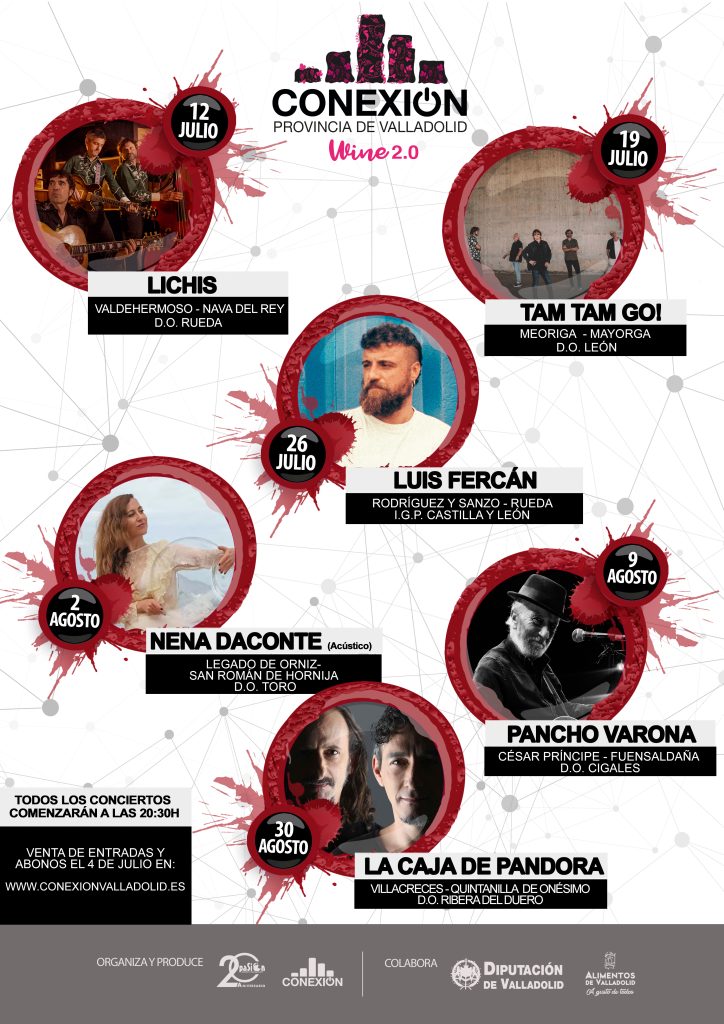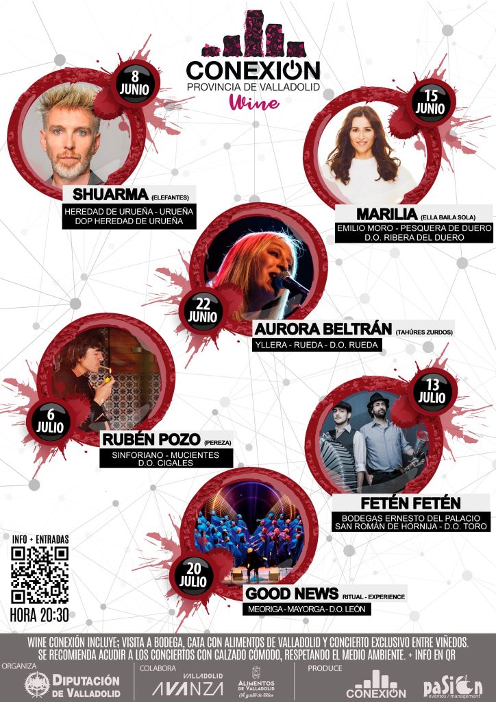 Este proyecto se enmarca dentro del programa de actividades del Servicio de Educación y Cultura y del Servicio de Promoción Agroalimentaria que se integran en el Área de Empleo y Reto Demográfico de la Diputación de Valladolid, el cual ha contado con escenarios enoturísticos para acercar la cultura vitivinícola, tradicional y vanguardista, a través de la conexión del territorio en un mismo proyecto. Un proyecto dinamizador que se ha desarrollado con la idea de llevar el alma del Festival Conexión Valladolid a la provincia, con la creación de un nuevo formato donde su esencia entrará en conexión con la cultura vitivinícola, el entorno natural y la cultura musical en lugares únicos de nuestra provincia como son las bodegas. Wine Conexión Provincia de Valladolid es un proyecto conectado a la provincia, que se vincula a varios territorios de marcado carácter vitivinícola, bajo cinco Denominaciones de Origen y Una Indicación Geográfica Protegida. En la provincia de Valladolid, la cultura del vino va más allá de la producción y el consumo. Se trata de una tradición arraigada en la historia y en la forma de vida de sus habitantes, desde la vendimia hasta la elaboración, el vino es parte de la identidad del territorio. Los hábitos, costumbres y las nuevas técnicas de producción son el engranaje cultural que hace de nuestra provincia un lugar por descubrir, con las experiencias y armonías que se reflejarán en este proyecto, a través de una visita con los cinco sentidos a estancias únicas como un antiguo lagar, salas de elaboración y envejecimiento, espacios tradicionales y vanguardistas y entornos únicos en cada territorio, como el propio viñedo. Seis referencias que apuestan por el enoturismo, la excelencia y el turismo como valores de referencia y que, siguiendo este argumento, la Diputación de Valladolid ha diseñado un paraguas cultural con seis eventos distinguidos, que tiene un objetivo en común: dar a conocer el proceso de elaboración del vino, nuestro territorio, la degustación de diferentes vinos y el maridaje sonoro de grandes músicos a nivel nacional. El proyecto cultural y musical comenzará el sábado 8 de junio, en Pago Heredad de Urueña, Denominación de Origen Protegida, bodega que comprendió el primer proyecto de recuperación del cultivo del viñedo y la elaboración de vinos en la comarca, ubicada en el municipio de Urueña (Villa del Libro). El encuentro comenzará a las 20:30h con la llegada de los participantes al aparcamiento de la Bodega, siguiendo con la visita a sus instalaciones para conocer el proceso de elaboración y posteriormente la degustación de dos de sus afamados vinos con la armonía musical del grupo barcelonés SHUARMA (Elefantes). Dirección: Carretera de Toro a Medina de Rioseco, VA-505, 22, Km, 21, 300, CP: 47862, Urueña. El 15 de junio será el turno de la D.O. Ribera del Duero, en una bodega con más de 100 años de tradición vitivinícola, Bodegas Emilio Moro, que se encuentra en el municipio de Pesquera de Duero, situado sobre el margen derecho del Río Duero. El encuentro comenzará a las 20:30h con la llegada de los participantes al aparcamiento de la bodega, donde serán guiados para descubrir la elaboración de sus vinos en el interior de la bodega, siguiendo con la degustación de dos de sus afamados vinos y la armonía musical, entre el viñedo, a cargo de la artista “MARILIA” (Ella Baila Sola). La dirección de la Bodega es Ctra. Peñafiel-Valoria, S/N, CP: 47315 Pesquera de Duero. El 22 de junio el enclave es la D.O. Rueda, en Yllera Bodegas y Viñedos, una bodega marcada por el carácter innovador de la familia Yllera, que se encuentra en el municipio que dio nombre a la Denominación Rueda. El encuentro comenzará a las 20:30h con la llegada de los participantes al aparcamiento de la bodega donde serán guiados hacia el viñedo para descubrir el proceso de elaboración de sus vinos con la consiguiente degustación de dos de sus afamados vinos y la armonía musical a cargo de la artista AURORA BELTRÁN (Tahúres Zurdos). La dirección de la Bodega es Autovía A6 Km 173,5, CP: 47490 Rueda El mes de julio seguirá latiendo con la D.O. Cigales, el 6 de julio, en la Bodega Sinforiano, una bodega que mantiene una viticultura respetuosa y una elaboración tradicional, en el municipio de Mucientes. El encuentro comenzará a las 20:30h con la llegada de los participantes al aparcamiento de la bodega donde serán guiados a conocer el proceso de elaboración de los vinos con la consiguiente degustación de dos de sus afamados vinos y la finalización del evento con un concierto a cargo del artista RUBÉN POZO (Pereza) entre viñedos. La dirección de la Bodega es Ctra. Mucientes – Villalba, Km.1 Dcha, Valladolid, CP: 47194, Mucientes. Siguiendo el mes de julio, el sábado 13 la D.O. Toro será la protagonista, a través de un gran evento en la Bodega Ernesto del Palacio, en plena Tierra del Vino, entre Valladolid y Zamora, el viaje se convertirá en algo familiar. La bodega se encuentra en el conocido municipio de San Román de Hornija. El encuentro comenzará a las 20:30h con la llegada de los participantes al aparcamiento de la Bodega donde serán guiados a conocer el proceso de elaboración de los vinos con la consiguiente degustación de dos de sus afamados vinos y la finalización del evento con un concierto musical a cargo del grupo FETÉN FETÉN. Dirección: Ctra de la Estación, 6, CP: 47530, San Román de Hornija. Y será el sábado 20 de julio con la D.O. León el culmen de este bonito proyecto provincial, en Bodegas Meoriga, de larga tradición vitivinícola con viñedos en su terruño arcilloso, bañado por las aguas del Río Rea y los cielos infinitos de la Tierra de Campos, en el municipio de Mayorga (mayormente conocido por tener el Museo del Pan). El encuentro comenzará a las 20:30h con la llegada de los participantes al aparcamiento de la bodega donde serán guiados a conocer el proce