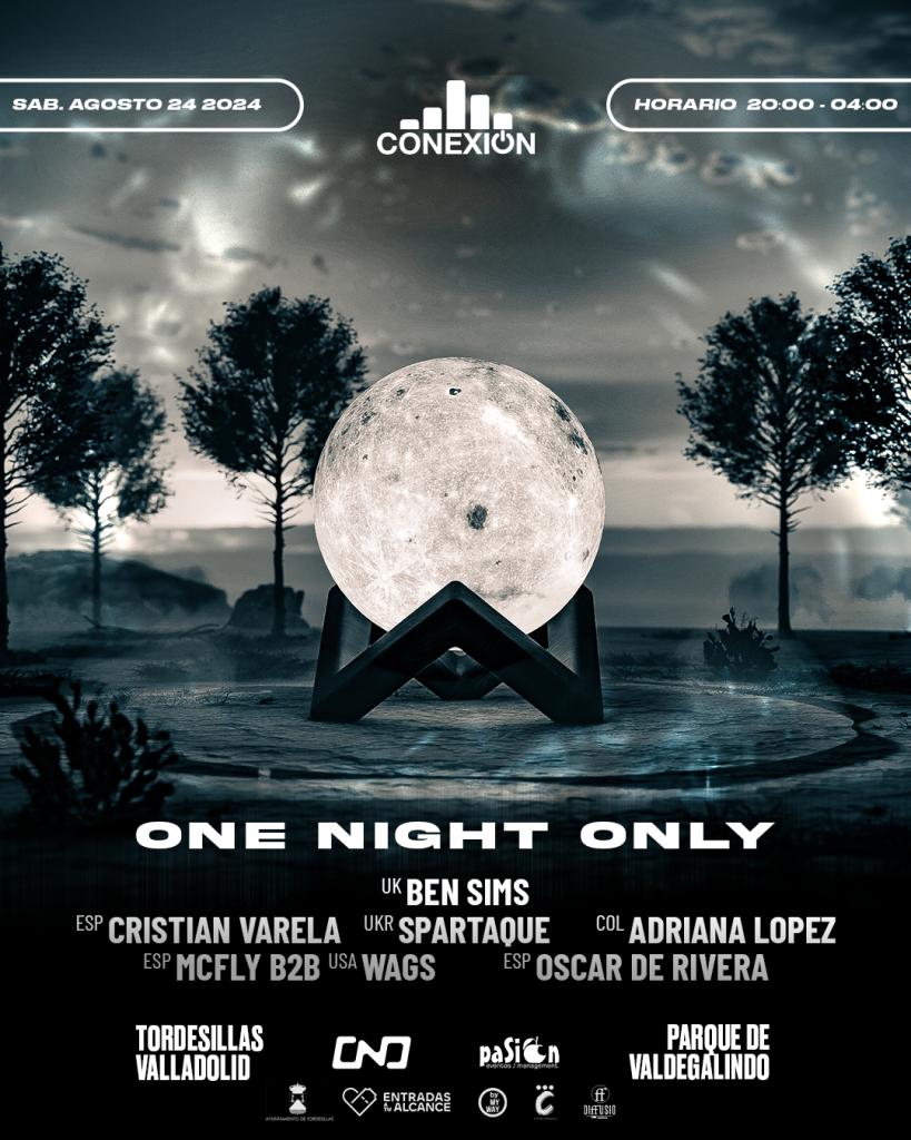 BEN SIMS – CRISTIAN VARELA – SPARTAQUE – ADRIANA LÓPEZ – OSCAR DE RIVERA – WAGS B2B MCFLY estarán el 24 de Agosto en TORDESILLAS (Valladolid) CONEXIÓN SPAIN y ONE NIGHT ONLY (Miami) se unen para traer a los mejores artistas de música electrónica del panorama internacional. ¡Prepárate para una noche inolvidable en el festival CONEXIÓN One Night Only, que se celebrará el 24 de agosto de 2024 en el espectacular Parque de Valdegalindo en Tordesillas, Valladolid! Este evento único es una colaboración entre el renombrado One Night Only y CONEXIÓN SPAIN, trayendo lo mejor del techno con un toque oscuro y vibrante. Ven y sumérgete en una atmósfera mágica bajo la luz de la luna, donde la fusión de estos dos grandes nombres promete una experiencia musical sin precedentes. Lineup Estelar Ben Sims, una leyenda del techno conocido por su estilo enérgico y su destreza en la mezcla, liderará el cartel. Con más de 25 años en la escena, ha tocado en los clubes y festivales más importantes del mundo, llevando siempre su distintivo blend de funk y hardgrooves. Cristian Varela, uno de los DJs más técnicos y respetados de España, traerá su innovador enfoque al festival. Su habilidad para manejar cuatro decks simultáneamente lo convierte en un espectáculo imperdible. Adriana Lopez, la talentosa DJ colombiana con sede en Barcelona, nos envolverá con sus sonidos profundos e hipnóticos que han conquistado escenarios como Berghain y Awakenings. Spartaque, el dinamismo y la energía del techno ucraniano, nos hará vibrar con sus ritmos potentes y melodías cautivadoras. Sus sets son garantía de un viaje musical inigualable. Además, contaremos con el talento local de Oscar De Rivera, quien traerá su extensa experiencia y pasión por la música electrónica. Conocido por sus actuaciones en los mejores clubes del mundo, su set será un homenaje a Valladolid y su vibrante escena musical. El evento también contará con un set especial b2b de WAGS x McFly. WAGS, conocido por sus espectaculares presentaciones en Ultra Music Festival alrededor del mundo, y McFly, residente de Fabrik Madrid, se unirán para abrir la noche con un set de techno electrizante que marcará el tono de la velada. Ambiente InolvidableEl Parque de Valdegalindo, con su amplio espacio al aire libre y su encanto natural, será el escenario perfecto para esta celebración. Imagina bailar toda la noche bajo el cielo estrellado, rodeado de buena música, un ambiente festivo y una energía vibrante.No pierdas la oportunidad de ser parte de CONEXIÓN One Night Only en Tordesillas. Asegura tu entrada lo antes posible y prepárate para vivir una noche mágica llena de techno, diversión y conexión en un entorno único. ¡Te esperamos el 24 de agosto de 2024 en el Parque de Valdegalindo para una experiencia musical que nunca olvidarás! ENTRADAS YA A LA VENTA KIT PRENSA CONEXIÓN – ONE NIGHT ONLY –24 DE AGOSTOPARQUE DE VALDEGALINDO – TORDESILLAS (VALLADOLID) SÍGUENOS EN NUESTRAS REDES Y NO TE PIERDAS NADA! Facebook X-twitter Instagram